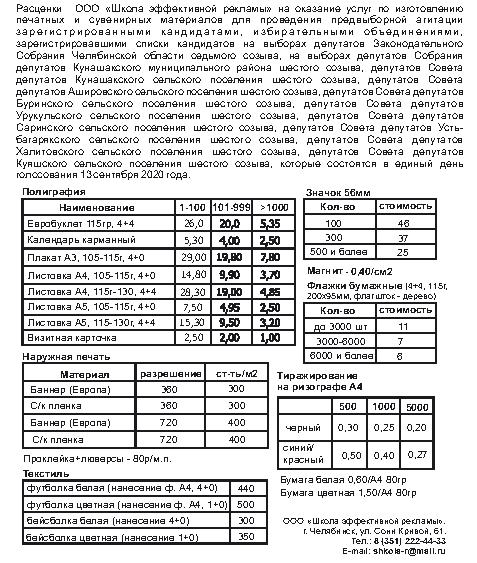Расценки АНО «Редакции газеты «Знамя труда» на оказание услуг по размещению предвыборных и агитационных материалов на выборах губернатора Челябинской области и на дополнительных выборах депутата Совета депутатов Куяшского сельского поселения по одномандатному избирательному округу № 1, назначенных на 8 сентября 2019 года.